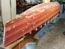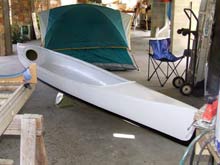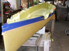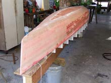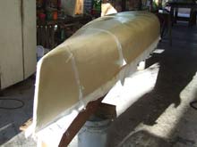 Took boat out in the yard and sanded hull. Cut out major voids and fit pieces of Kevlar felt in voids. Epoxy coated hull and covered Kevlar patches with 4 oz glass and peel ply.
