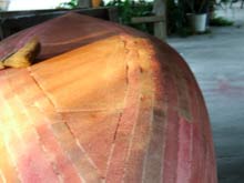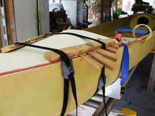 Some problem on part of gunnel, foam/Kevlar interface not quite wet out enough, would have been better to apply some epoxy directly to foam, but much risk of having Kevlar swarm in the wind. Oh well.