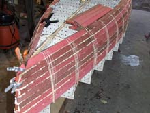Cold today but I need to forge on. Put new packing tape on form. Added nails in edge of forms at sheer, holes were predrilled. Put a strip of ¼” thick strips of mahogany along sheer to reduce depth of boat just a bit and to spread out the load between nails and form. First sheer strip goes on in one continuous piece to help keep everything fair; rest of boat is stripped with four foot pieces. Got shear strip and one extra layer on boat. That’s all; I’m not much good below 50 degrees.