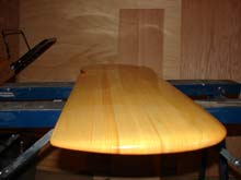 | A straightedge was placed perpendicular to the profile on occasion to make sure it maintained an even curve, like an airplane wing. I kept that line of thought as I faired both of them. It was messy but in the end, “wing like”. |