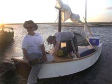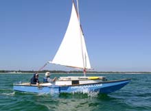 Attached is a picture of Helen at the helm of our Frolic2, Oaracle, from last Sunday, taken at St. Joe Bay -- a great place to sail if you can find the time on your eastward swing this spring. It was taken by Olivier, the first time he and Tiffany had the Goat Island Skiff out on really open waters. It was interesting to see how the boats compared. Downwind, we were about even, although the GIS seemed to pull away a bit. When we reached into the beach for a picnic lunch, Oaracle was a bit faster. When we left the beach hard on the wind, it was no contest. Oaracle just walked away from the GIS, which seemed to be doing pretty well. That's probably partly because the wind had picked up and we put in reefs, although they weren't really needed -- and then the wind lightened. Also, Olivier was sailing flat rather than heeled for Tiffany's peace of mind, and I think flat-bottomed boats should be heeled a bit, especially in a chop (we could see their motion was much livelier than ours). And it was the first extended beat the boat had been on. We'll be doing some more testing . . .
