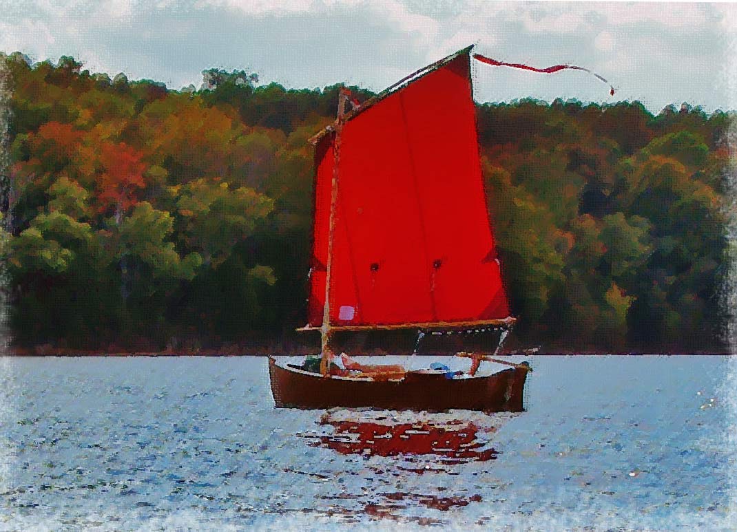I love looking every morning and hope to send some additions next year for now this photo is worth a gazillion Words.. It is me under sail in HOPE. The Builder, Stacy Smith, Made the photo on Percey Prest lake and did his thing to it.