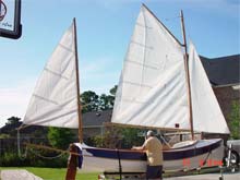 The first thing discovered was the best seating position, but only after trying them all. Being alone in the boat was an advantage because I could easily make changes without question, or confusion. With a good, constant wind, and sitting in the center seat, I discovered that the bow had a tendency to plow the water. Changing to the aft seat corrected the problem. After thinking about the cause, I concluded that as the boat heels to one side, the shape of the hull in the water changes, causing the center of buoyancy to move aft. Moving weight aft (in this case me) is a logical correction. All further sailing was conducted from this position, or on the floor in front of the aft seat, the only problem being that my body was at times in the way of the tiller. I have yet to figure how to simplify this situation, other than to raise the tiller over my head, shift my position, and place the tiller on the other side, which I did many times. With regard to sailing with a partner, I suspect if one person were to sit in the center and the other aft, balance should be met, as the finished design of Pollywog differs from my prototype by increased stern curvature.