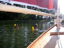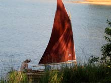 Sorry I don't have a better photo but it does show the genuine Duckworks Sail. I wasn't brave enough to sew my own sail. The boat is a lot of fun and operates very well. Jim Michalak's book made it very easy to build.