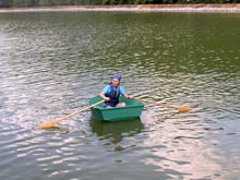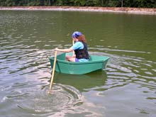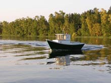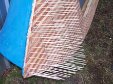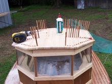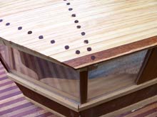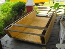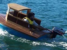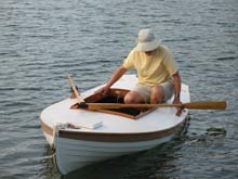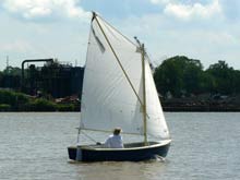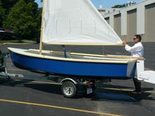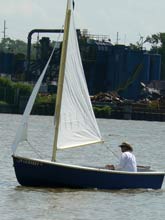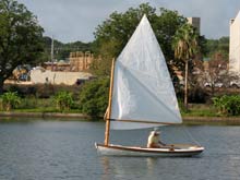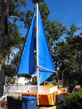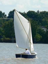 Epoxy was West Marine throughout. I made the sails from bolts of sailcloth, software and hardware purchased from Sailrite (and you guys) according to the techniques in Marino's book "The Sailmaker's Apprentice" - lofted and basted with 3M Super Seamstick, machine seamed and hand finished. She is a deep forefoot keel skipjack design and has no centerboard. Windward performance is good within 4 points of the wind on either tack, and gaff twist is controlled with a vang that can be cleated aft and controlled by the helmsman.