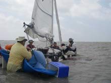 Why, why did they appeal to me? It was that total lack of pretension, the having-fun-out-here attitude, the struggle through adversity and laughing all the way. Who thinks sailing a four foot by eight foot sandbox 200 miles isn’t adversity? Then stopping and helping everyone else along the way, just because it’s the right thing to do, expecting no thanks or reward? Andrew Linn was actually fearful I would be angry he helped Mike finish the race…Andrew fully expected him to sail to a rescue point and drop out.