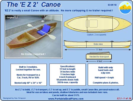Composed of 3 modules that bolt together, and employing optional buoyancy compartments, it becomes an 11 foot long, easy to paddle canoe style craft. Nested, it sits in a space only 4 feet long, 34 inches wide and 16 inches high. Small enough to fit in almost any vehicle. The finished weight is still under 50 pounds, easy for almost everyone to lift. And, with a slightly truncated stern, a trolling motor could easily be affixed with the addition of a mount. It's new name is the 'EZ 2' Canoe.