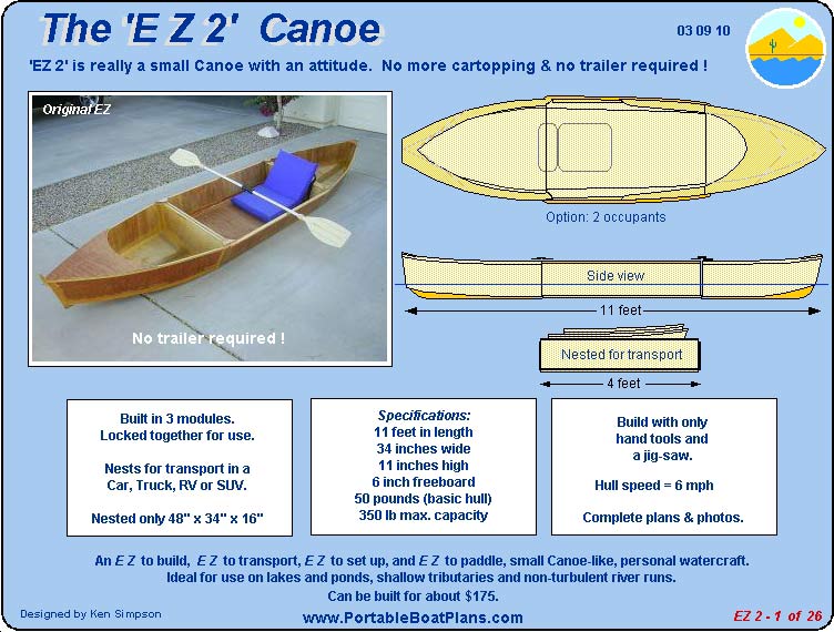 It seems we have been having a record wet winter season here in Arizona. As a result, it has delayed some of my projects, and caused others to be expanded. In the spirit of change, I have redesigned the EZ CANOE to be more technically current, and a little more roomy. It now employs features I find to be easier to assemble, and at the same time provides a more durable little boat. Of course it is of a portable design, much like it's predecessor.