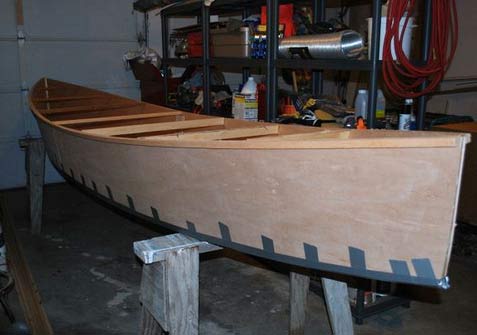 Rick is kneeling in the boat while he works out whether he will trim the skegs for faster turning and just where he will put the seats. The plans say where, but he's done a lot of canoeing so he is working it out to suit himself.
