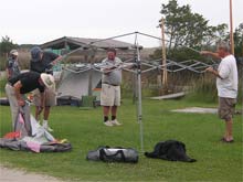 Our campsite was a flat patch of deerfly-infested ground that housed the ruins of the Core Sound Rod and Gun Club. While I slathered on sunscreen and bug spray, I struck up a conversation with the grizzled foreman of a survey crew that was driving a reference stake into the front lawn of the club. This man had attended parties at the gun club in his youth and told me a bit of its history as he monitored the other two members of his crew from the comfort of a folding chair. I learned the US government converted the Outer Banks into a National Seashore in the early 1970's, condemning all the buildings and residences thereon. At first, the foreman had been angry about the condemnation, then finally admitted it had probably been a good thing. [to be read in a deep, gravelly voice with a thick, southern accent] “Sure'n the club took care 'o thea prop'ty, but mosta the folks were just trashin' these islands. The gub 'ment musta hauled ova 4,000 rustin' cars offa hea. Cain't even begin ta' count the tons o' garbage. People done got theyselves kicked offa these islands.”