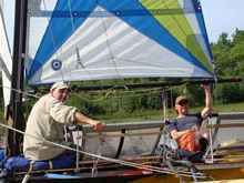up his white Windrider 17 in the marina parking lot. Joe is tall,