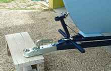 The launching dolly is secured to the boat by a 10mm pin (an old bolt) through the boat's towing eye. The eye is given some protection by being nestled in a shaped wooden block glued into the U- shaped piece at the top of the front post of the dolly. The dolly is in turn secured to the road-going trailer by the shackle visible just above the two handles.