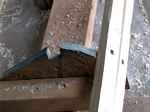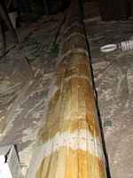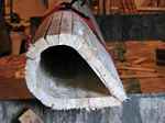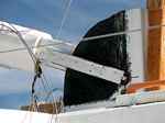 The broken mast had replaced an earlier one that I was told rotted at the spreader—probably due to inadequate protection when the bolts were inserted. The more recent broken mast consisted of two 2” x 6” (spruce?) boards epoxied together with a small centre slot to allow internal wiring. It was covered with a thin outside layer of fibreglass, but the strength was in the wood. The recent break happened when the lowered (horizontal) mast began bouncing while the boat was going over potholes. The A-frame supporting at the middle of the mast collapsed and the mast dropped about 4’ onto the stern structure, snapping it neatly in half. The two pieces with the rigging were hauled up on deck and the trip home was completed. (The loss of a wheel bearing on that eventful 2-mile trip is another story!)