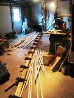 With the entire winter ahead, I remembered a small bit in The Gougeon Brothers on Boat Construction (5th edition, Meade Gougeon, pp 278-9) where they expand their strip canoe section to suggest the same technique can be used to construct hollow masts. Being severely budget-limited, it seemed fascinating. I could get epoxy (from Noah’s—not WEST system because it is not available locally on PEI and I long ago got started using the EAST system 5:1 product that is stocked in the local boat supply shop) and surplus fibreglass (from Defender). I already had lots of lumber cut from trees in our woods, so it looked like a winner.