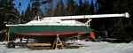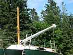 Somehow I forgot to get pictures of the final set-up—we got done so late in the season we only went out once before a passing hurricane convinced me to tow the boat back home. The only photo I have is a shot last week of the mast at rest (under 6” of snow).
