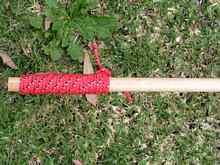 I could not find eyebolts locally to take the 1" dowel I am using but I found an eye nut that worked. I attached mine to the side of the rudder stock using 1/2" threaded rod - galvanised was the best I could get. A rope in one end and a rope grip on the other was the go I decided. The rope should stay. If not I will rough up the dowel and glue the rope to it. I used fishing rod runner binding techniques. There is a description of the tying here. It works well and you can even push the tiller back to pass behind your back on a tack and then pull it forward again.