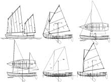 As an example, here is a sketch showing my Periwinkle design with six different rigs, all of which use the original set of mast locations, and most of which use the original main mast.