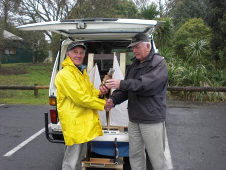 The latest winner of the Ancient Mariners/US Great Schooner Model Society annually awarded trophy for the builder of a model multi-master of merit, John (left below in yellow raingear) was awarded the trophy on the 9th September, the trophy handed over as is customary by the previous winner, John Stubbs. Photo by Richard Gross, also a previous winner.