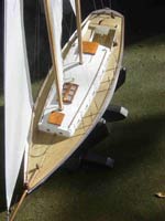 The keel is built up using eight pieces glued and screwed with four 5mm wood permanent frames. A 5kg cast lead keel weight is built into the keel and once the hull was completed he used a nother 1kg weight to balance the waterline fore and aft. Planking is hard grain balsa 3mm thick and then a coat of epoxy then a skin of fiberglass. Deck beams, carlins etc are 5mm wood with a 3mm ply deck which was then finished with a 0.75mm wood strip laid deck.