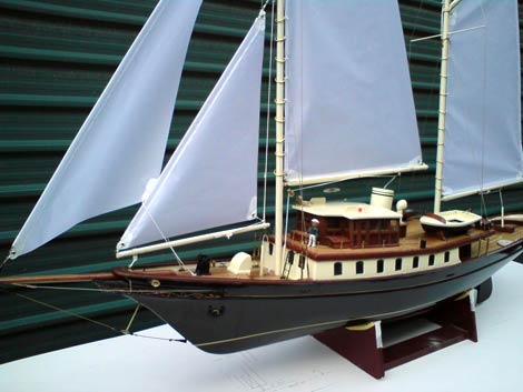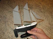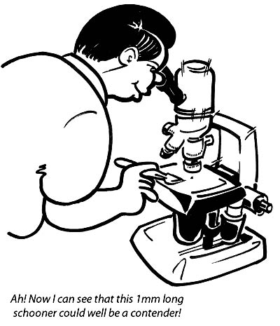 The idea for my challenge actually started while seated one wet New Zealand Winter morning on our `porcelain pony’ (well, many people get their best ideas in the loo!),  that of wondering just how small a model schooner could be made to incorporate radio control. I made it as easy as possible in that the entries could be scratchbuilt or kit-adapted and aware of the ingenuity of some keen modelers, I envisaged that an eight or nine inch length on deck model would be about the limit, in other words a 12” Footy would just not be competitive. Was I  surprised? Was I ever!
