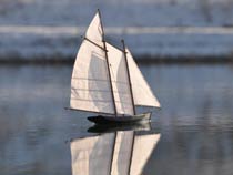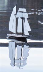Right then – who  won the principal award for the smallest RC schooner I hear you say! Well there were fewer entrants than freesail and the winner of the smallest RC schooner on Planet Earth was Hans Berger of Plainville, Connecticut fpr his topsail schooner with 3 channel RC Gypsy II with a deck measurement of 3.905 inches. Mike deLesseps of Maine in the US. For his second entry schooner Suzanne took the runner award. The boat was well thought out, a good looker and quite enchanting, I loved the photograph he took of it in the shallows with his little tug Brutus.