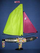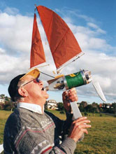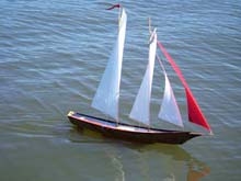 Many who indulge in cruising the internet will have come upon and feasted their eyes on the photograph above seen on at least four different websites accompanied by virtually zilch in the way of information. `Created by a French designer’ (it was said on one website) after which I was unable to find the gentleman mentioned by name anywhere and I deduced that it could even be a hoax - a model skillfully made by someone wild on imagination and equally skillfully implanted on a fake photo using Adobe Photoshop or some similiar photo-altering system. Someone who drew my attention to it is convinced that this great `whatsit’ is in fact an alien spaceship with both flying and fast supersonic sailing capabilities. (Hey, don’t scoff at that, I’ve come upon some mighty strange findings while searching Planet Earth for the smallest RC model schooner! And that was just on our planet!!!) The jury is still out, but my belief is, it is more likely to be one of the main combatants secret boats for the next America’s Cup which has become weirder and weirder in boat design and is well on the way towards being stuffed up for ever and ever! The craft will `fly’ one leg and then `sail’ the other! The third leg? Well, the hull must submerge completely and the `above bits’ emulate a duck flapping its wings for propulsion! If it waddles when sitting still on the water and looks like a duck…. It gets curiouser and curiouser!