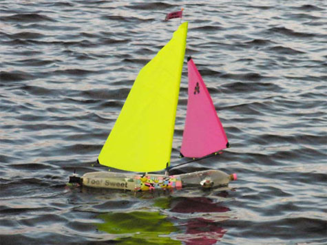 There are model sailboat fans who really enjoy building and then sailing bottle boats – that is boats with hulls made of once full now emptied bottles. In the UK they are even raced competitively and many are colourful and have humorous paint jobs and `hull’ designs. Andy Trewin who has built other bottle boats before has sent me a photograph of his latest, Toot Sweet shown above. Whether the performance is also `toot sweet’ we will never know. I’ve been thinking…were bricks able to float…well there would probably be a class for `brick boat’ racing! Seriously, bottle boats generally sail very well and they make up a popular racing class in UK. Read Chris Jackson’s article on the 2019 Bottle Boat Championship in the January 2011 issue of Marine Modelling International.’ -30- Click Here for a List of Articles and Columns by Mark Steele |