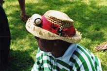 (above) Ron Rule in self-festooned hat swore that a would-be axe killer among the group had tried to cut his skull in half!