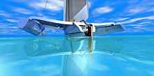 This boat is not equipped with any sort of trick lifting foil arrangement in order to keep costs, weight and build simplicity near the top of the design criteria. There is a simple, diagonal daggerboard which slides through a trunk in front of the mast step. The rudder head can be a unit from just about any beach cat that has a flip-up feature, or the builder can go with a more deluxe setup from Dotan. A longer rudder blade is suggested for control throughout the sailing range.