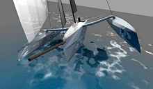 The skipper sits in the main hull in a semi-reclined position, much like the driver of a Formula 1 car. The main deck of the cockpit is slanted aft for self-draining through the open transom. All controls are led to the cockpit and the rudder is controlled with foot pedals. For those who wish to put the hammer down, the skipper can exit the cockpit and sail the Corsica from the tramps with a tiller extension and an easy re-routing of the sheets.