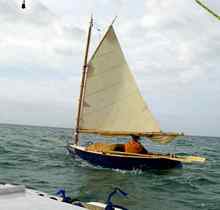 The only problem was about halfway out the bay, the tie that held the peak of the lugsail to the yard came undone. (Note for next year: Double check all such lashings before leaving the beach.) Since the sail is tied on with separate ties, this was only a minor inconvenience especially since we were off the wind. The water was choppy and I was reluctant to stop and fix it until the seas were calmer.