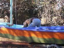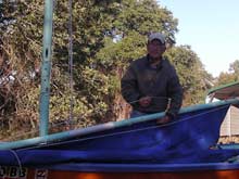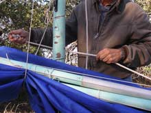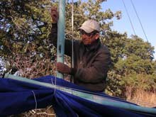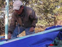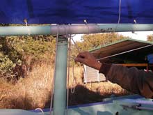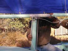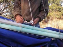 12) Wow! This is getting long, isn't it? Fortunately we are almost there. If you are losing focus, go back to the top of the page and play that video again - that will remind you what we are trying to accomplish. Oh, yeah, here I have brought the forward lazyjack around outside of the sail and both spars and will attach it to the clamcleat by my right hand in the picture at left.
