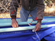 8) Here it may get kind of hard to follow since I have shifted the spars. The upper one is still the yardarm and the lower one is the boom. The line in my hand is the starboard lazyjack. It has come around the yard, sail and boom before going through the block. "A" indicates this line before it goes around the whole mess. "B" indicates the port lazyjack which is attached to the shackle - you can't see that shackle in this picture.