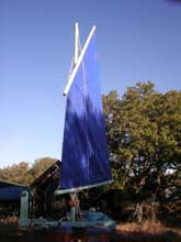 16) Now hoist the sail. You will see the for and aft lazyjacks when you enlarge this picture. Note that the part of the aft lazyjack between the boom block and the cleat is slack. If the aft lazyjack is too tight, it will form a crease in the sail. Remember step (10) where I talked about making loops in this part? These loops hooked over that cleat will tighten or loosen the lazyjacks.