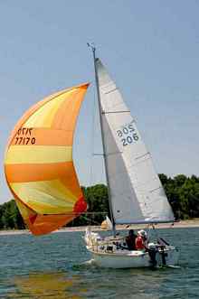Some racers get a new set of sails once a year. Thistle sailors are restricted to no more than one set of sails a year, to prevent an arms race. Many of the strings on a race boat are to control sail shape. An old, blown-out sail can’t be flattened or otherwise controlled, and is slow in all but the light to moderate air that might allow you to benefit from baggy sails. Going to windward in heavy air, a sail can be de-powered by flattening it, but only if it isn’t stretched out. With a choice between spending money on the hull or the sails, money spent on the sails will make your boat faster.