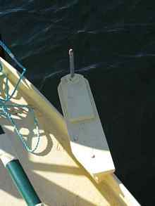 The first yuloh was about 18 feet long with a six inch wide blade at the tip which tapered to about four inches where the blade exited the water. We mounted the yuloh on a trailer hitch ball, more commonly seen on the rear of cars for towing boats and utility trailers. This yuloh was in two pieces so that we could do some adjustments, if required lengthening or shortening became apparent. From our research we felt that we had a prototype that met the basic design factors. We were not sure about how the bent shaft would work so this was not built in. A straight shaft with the top end of the handle attached by a lanyard to the deck at waist level was our first introduction.