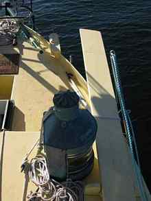 8. Draw in the lanyard from the tip of the loom sloping forward some 14º to the level of the yuloher's feet. We placed a eye bolt in the rear bulkhead at the deck level giving a forward angle that seems to be doing the job. I don't believe it is a full 14 º but it does work.
