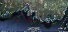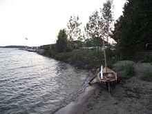 Light headwinds, one of Jagular’s many weaknesses. Rowing, one of mine (though I’ve gotten much better on this journey). Calorie deprivation setting in—haven’t had much interest in eating in the past two weeks, too busy sailing. After a couple of miles, I decide it’ll be worth it to hoist the sail and treat myself to a long afternoon of tacking. Houses are fairly common along this stretch of shore, it turns out. If I weren’t barred from camping ashore until clearing Customs, I’d have to be on the lookout for an isolated stretch to camp on. It might have ended up looking something like this:
