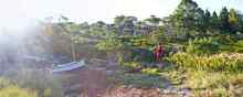 It was now time to assess the situation. We were a good cold swim from the island, stuck fast on rocks that were just submerged below the high water line. I tried to get off the boat to lessen the load and the crunching noises only to find no place to put my feet. These rocks rise vertically off the bottom and we were perched on top of a pinnacle like a hapless woman in a King Kong movie. Working quickly and quietly Jason and I grabbed oars and in concert slowly nudged Zinea off the rocks and into clearer water. My heart rate was somewhere north of bursting, and once clear I shakily rowed her to the nearby campsite. Unperturbed and unconcerned of the water sloshing in the bottom of the boat that may be coming from a breached hull, Jason exclaimed at the wonder of the bioluminescence that swirled around the oars and quickly we were again entranced with its siren song.