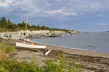 Like all good things, this time on this rocky island must too, come to an end. On the fourth day we rose to find the sky gray, with fog on the horizon, some spitting rain, and a rising wind. The tide was up in Cocktail Cove, a serene harbor with campsites on cliffs above the water. Cocktail Cove was our last anchorage for the trip on the inland side of Jewell Island, and the waves were rolling in from the south-west through a breach that fills in at high tide. After packing our belongings we made our way down the cliff to the water, and I hauled the Goat into shore on her haul out. I clumsily clambered aboard and Jason tossed me dry bags and buckets from his precarious perch on the spray soaked rocks. The boat would rise and fall in the three foot waves which crashed around Jason. After the last item was thrown aboard he too climbed over the transom with the land-based anchor. I don’t remember how we did this without going for a swim, swamping the boat, or losing our possessions, it was straight out of a rum-running-escape-from-Prison Island movie. In a word, it was dramatic. Once we collected the haul-out anchor we raised sail and sped out of the cove, past a German sailing vessel also anchored for the night and we headed into Casco Bay, Portland bound. Our last day was a slog back home, with high winds and seas until we got into the inner portions of the Bay, where the front passed and we were calmed for a bit, but at least now we were in warm sun. After a bit the wind picked back up and we scooted right into the dock and past the notorious piling that ate my sail, and “I am Zinea, Pterodactylus” was soon back on her trailer and VisionQuest/ManQuest2010 was complete.