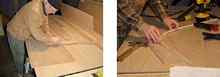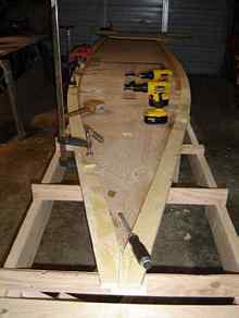 The strongback had been left to this point of construction as there was enough room in the shop to not need it as a 'workbench' for the frames etc. The large bottom panel was scarfed and layed to it's profile curve with blocking from the horizontal strongback. The cleats on the outboard sides of the bottom panel proved to be a bit of a challenge in bending them to the curvature dictated by the panel due to their designed scantlings but with adequate clamps and judicious placing of the scarf joints, they were muscled into place and secured with epoxy and 10 x 1 screws.