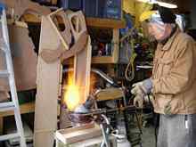 The frames were all struck out and assembled and stacked ready for set-up while work continued on the transom, stem, and centreboard and trunk and the long, scarfed bottom panel. As the centreboard required some 40 + lbs of ballast, a 45 lb cannonball from our retired troller was tossed in to a pot, toasted with a tiger torch, poured into a rectangular box that would fit snugly into the cavity cut out in the lower end of the centreboard. The lead slug was dimensioned so as to be able to split the cut-out piece and epoxy the two halves either side to enclose the lead ballast, to be faired flush with the rest of the centreboard.