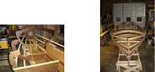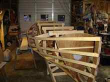 Now came the quick, fun part of the set-up. With all the bits and pieces of the framework waiting patiently on the sidelines, they were soon temporarily in place on the bottom panel and sighting checks were made to see if the dimensions so carefully laid out frame by frame actually faired nicely with each other. Compliments to the designer and the "offsets man" who picked those dimensions from the original lines plan; all was within reason with a tweak here and there. The only noticeable 'wump' was the framing that provided the motor mount that had a 7 degree tilt aft by design; despite assurances that it's shape had been 'developed' to compensate for it aft leaning disposition, it was obvious that is was not - temporarily laying in the stringers indicated a pronounced 'bulge' which was subsequently faired out by reducing the frame's girth..