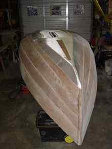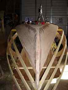 A layer of 6 oz glass set in West System Epoxy, was laid over the bottom panel and partway up the first plank( in anticipation of taking a few beaches here and there to unload camping gear before springing her back out to anchor).