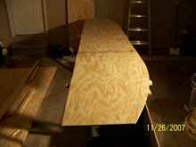 With the bottom skins glued and screwed, the countersunk #6 screw holes were filled with wood flour/epoxy, sanded flush, and 12 oz 6 inch wide biaxial tape was epoxied to the critical joints. |
