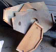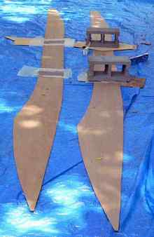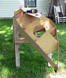 The bilge panels are deliberately cut oversize. Here, they are temporarily fitted and marked for final cutting. |