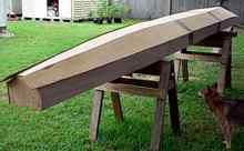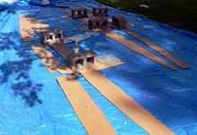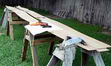 When the epoxy has set, the finished panels are taken to the back yard, ready for the boat to go 3D. A 20-foot panel of 4 mm ply is pretty limp stuff! |