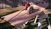 Everyone has their favorite way of cutting out panels. Mine is to use a circular saw with the blade set just to pierce the ply. Here I’ve got two sheets clamped together so two panels can be cut at a time. |