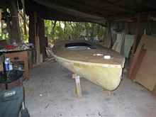 Jose and I lifted the glassed hull off of the mold easily, probably weights 60 pounds. I'll let you know how it works out, I'm sure it will be at Cedar Key in May. It was so much fun that Jose started one for himself, we already have the rigs for them so we can try them out without a whole new rig. You can see from Roger's expression what he thinks of it, actually he's as curious as I am how this will work out, some think it'll explode when I stress the hell out of it as I'm prone to do.
