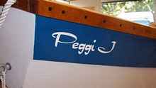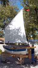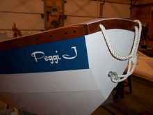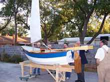 My wife and I finished our Sherpa "Peggi J" during October 2010. We are going to wait out the winter for the maiden voyage as we are currently without a suitable trailer to carry the boat. Our current project is a folding trailer for the boat. Peggi J was rolled outside on the building jig. The sail was hoisted.